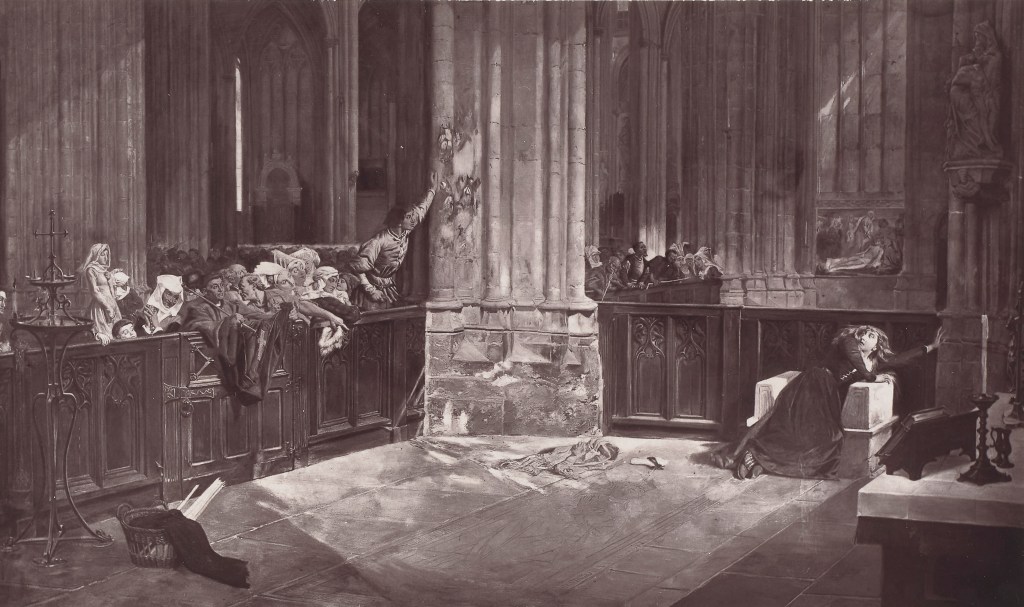 ‘Sanctuary’ by Eyre Crowe A.R.A. (1877). Photograph taken from ‘The Royal Academy album: a series of photographs from works of art in the exhibition of the Royal Academy of Arts’, ed Samuel Jennings, 1877. Credit The National Library of Scotland. Creative Commons licence CC-BY, https://creativecommons.org/licenses/by/4.0/.