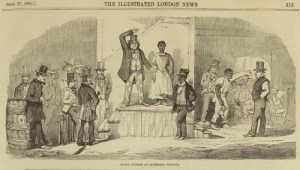Crowe published a long article, ‘Sketches in the Free and Slave States in America’ in The Illustrated London News on 27 September 1856, accompanied by 11 of his own pen and ink sketches: ‘Taking an after-dinner whiff at Charleston, Carolina’, ‘General Cass in the Senate, Washington’, ‘Glimpse of ‘Change, New York’, ‘Negro Expulsion from railway car, Philadelphia’, ‘Close of business at Wall-Street, New York’, ‘Young America, Boston’, ‘Theodore Parker lecturing in New York’, ‘Slave Auction at Richmond, Virginia‘, ‘Baltimore, Maryland’, ‘Slaves Waiting for Sale, Virginia‘, and ‘The Negro Reveillee, Charlestown’. The article explained the differences between North and South, and the slave trade within America, and described Crowe’s horror at witnessing an auction: ‘No pen, we think, can adequately delineate the choking sense of horror which overcomes one on first witnessing these degrading spectacles’.