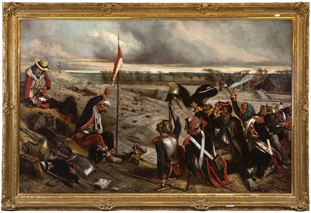 A group of wounded Frenchmen listening to an oration by one of them to the rest. The speaker, a veteran lancer of the old Guard, sits on the ground, with his lance stuck upright at his side.