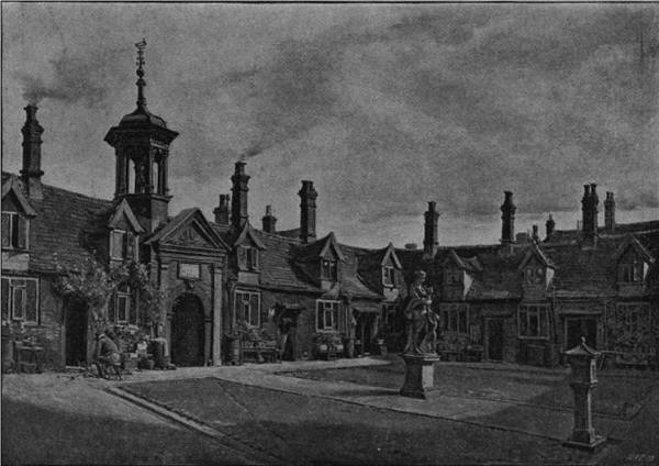 Fishermen’s Home, Great Yarmouth (719) is a bright representation of a wide quadrangle enclosed by old red-brick buildings, whose roofs are high pitched and tiled, while the dormers are unusually ugly. A sculptured group illustrating charity stands in the middle of the place, where the rainy sunlight and its blackish shadows are not at all cold.