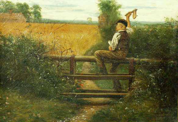 According to Eyre Crowe’s diary, he had first painted this subject at Henley in 1872. He found the picture again when he moved his effects out of storage and into his Chelsea studio in 1894, and took the picture on holiday with him to Great Yarmouth, where he traced the outline and began to repaint the boy on the cornfield stile. The picture was exhibited at the Royal Academy in the summer of 1897, and at the Walker Art Gallery in Liverpool in the autumn of the same year.